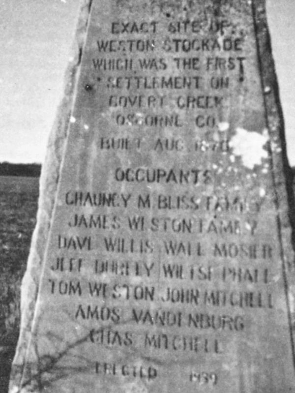 From 1870-1872, several families and a group of “bachelors” used this stockade around five log cabins and a barn. Covert Creek, Independence Township, 13 miles from Osborne.